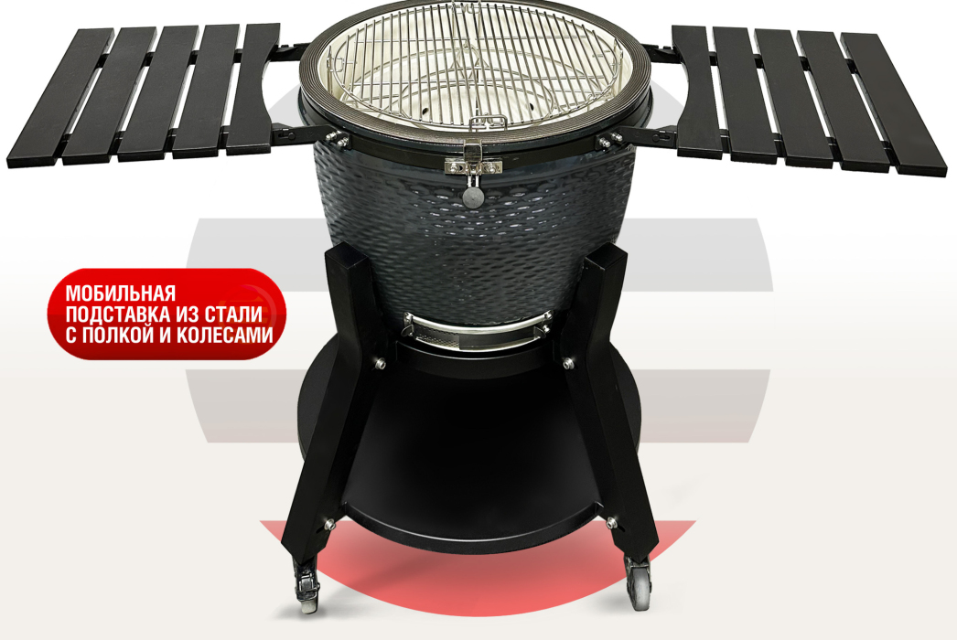 Мобильная подставка с колесами, оснащенными фиксаторами, выполнена из стали, что гарантирует высокую надежность и легкость перемещения гриля. Подставка оснащена стальной полкой для удобного размещения аксессуаров и кухонной утвари.